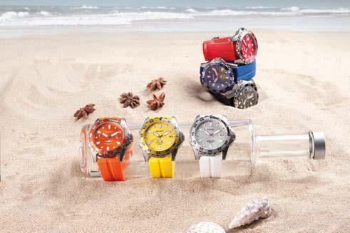 ronne vissée, une lunette unidirectionnelle crantée, des aiguilles de bonne taille pour plus de lisibilité et arbo-rent un bracelet en silicone de couleur assortie. Pour une sortie plongée dans la bonne humeur ! ■ ——————————————