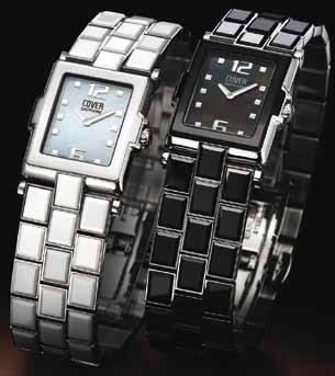 élégante et classique. En 2012, nous avons présenté 11 nouveaux modèles de montres, déclinés dans 50 gammes variées. Dans la gamme Cover aQuartinoChronograph n acier PVD, all black, a ne vraie personnalité ec son boîtier octogo-et son cadran noir. En on féminine elle garde caractère, mais ses sont adoucies par une aux angles émoussés et cristaux. La plus specta-culaire est sans doute la version noire avec ses cristaux roses, son cadran violet, montée sur un brace-let en inox noirci.