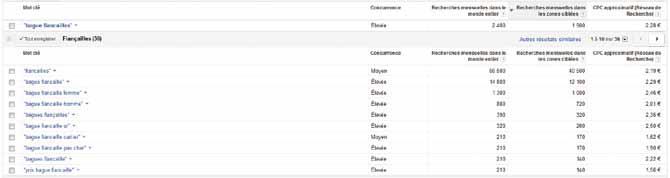 Google indique aussi que cet autre mot clé « bague fiancaille » - sans « s » à fiancaille - est très intéressant, car il donne 12 100 recherches par mois, soit 6 fois plus que le mot pré-cédent.