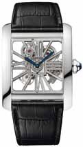 et harmonieuses, la justesse de ses lignes tendues, le naturel de son galbe discret, font l’éloge de l’horlogerie se l on Car t i er. Dotée du premier mouvement Manufacture de la Maison, le 1904 MC automatique, visible à travers le verre du cadran et le fond saphir de la boîte dans la version squelette de la montre, elle conserve toutes les caracté-ristiques de la Tank. Une petite seconde, un cadran guilloché, un chemin de fer graphique et des chiffres romains noir sur blanc ou blanc sur noir.