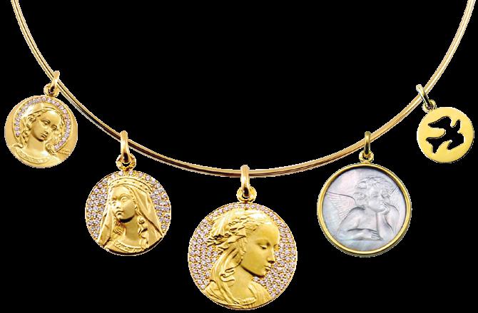 la passion des hommes a donné de plus beau à l’art à travers les siècles. La très large collection reproduit d’anciennes sculptures ou peintures bibliques sur des médailles rondes, ou irrégulières comme des pièces usées par le temps, ou au contraire très modernes, comme cette colombe à l’envol dont l’épure est symbo-lique de la religion protestante qui protège ses temples de toute osten-tation. Chaque médaille est une histoire et celui ou celle qui la porte doit savoir la raconter. Un saut dans les siècles nous amène à découvrir aujourd’hui des collections de bijoux très contemporains aux lignes sobres et simples qui leur donnent un côté talisman, discrètement illuminés de