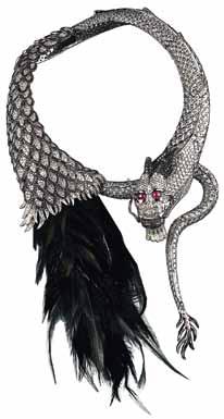 Collier Dragon or blanc, diamants blancs, diamants noirs 89.37 cts, rubis, plumes - Georland