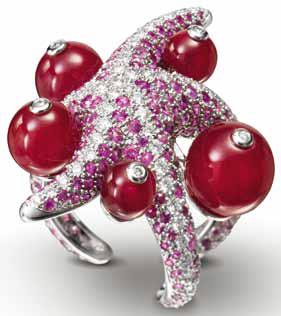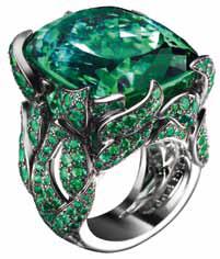 nant sautoir guerrier serti de colts… l’insolite exposition ne laisse aucun repos à notre imagination. Les visi-teurs les plus curieux devineront même les bijoux du futur en s’attar-dant dans l’espace des tendances. A la fin, dans le petit couloir tout noir de l’espace « anti-reflet », de lumi-neux papillons en calcédoine bleu ciel sont posés sur un fil d’acier bar-belé noir, des diamants de couleur, des pierres précieuses, dont une émeraude de 20 carats, sont sertis sur de l’or noir. Les précieuses gemmes sont comme des fleurs écloses sur des pierres de lave, ciblées par un rayon de lumière qui en accentue le contraste.
