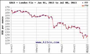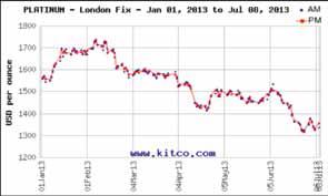 Le cours de l’or de janvier à juillet 2013. En $ par once. Le cours du platine de janvier à juillet 2013. En $ par once.